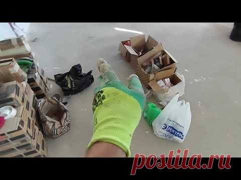 На изображении видна рука в ярко-зеленой перчатке среди различных предметов, вероятно, во время уборки или сортировки вещей. Вокруг расположены картонные коробки, упаковка и другие предметы на бетонном полу.