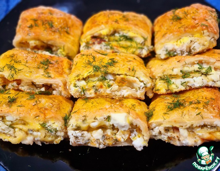На изображении представлена выпечка, разрезанная на порционные кусочки и украшенная укропом. Выпечка золотистого цвета с видимой начинкой, возможно, содержащей сыр или мясо.