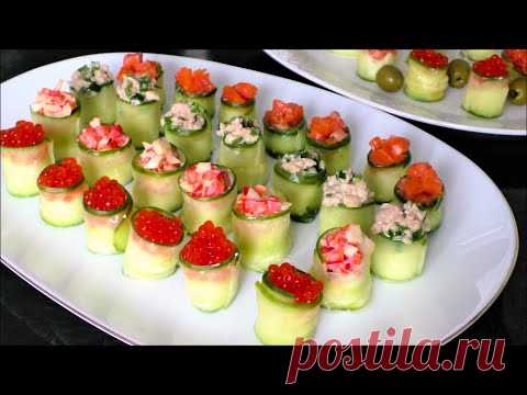 На изображении представлены закуски, состоящие из огурцов, начиненных различными ингредиентами, такими как икра, крабовое мясо и творожный сыр. Закуски аккуратно уложены на белое блюдо.