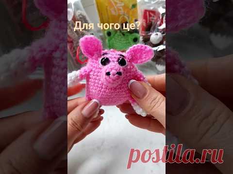 На изображении представлен розовый вязаный амигуруми в виде свиньи, который держат в руках. На заднем фоне нечетко видны другие предметы.