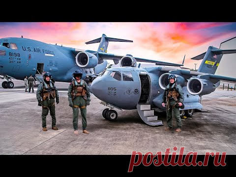 На изображении военнослужащие ВВС США в полном снаряжении стоят перед военно-транспортным самолетом на взлетно-посадочной полосе. На заднем плане виден еще один военный самолет, и небо с красивыми оттенками заката.