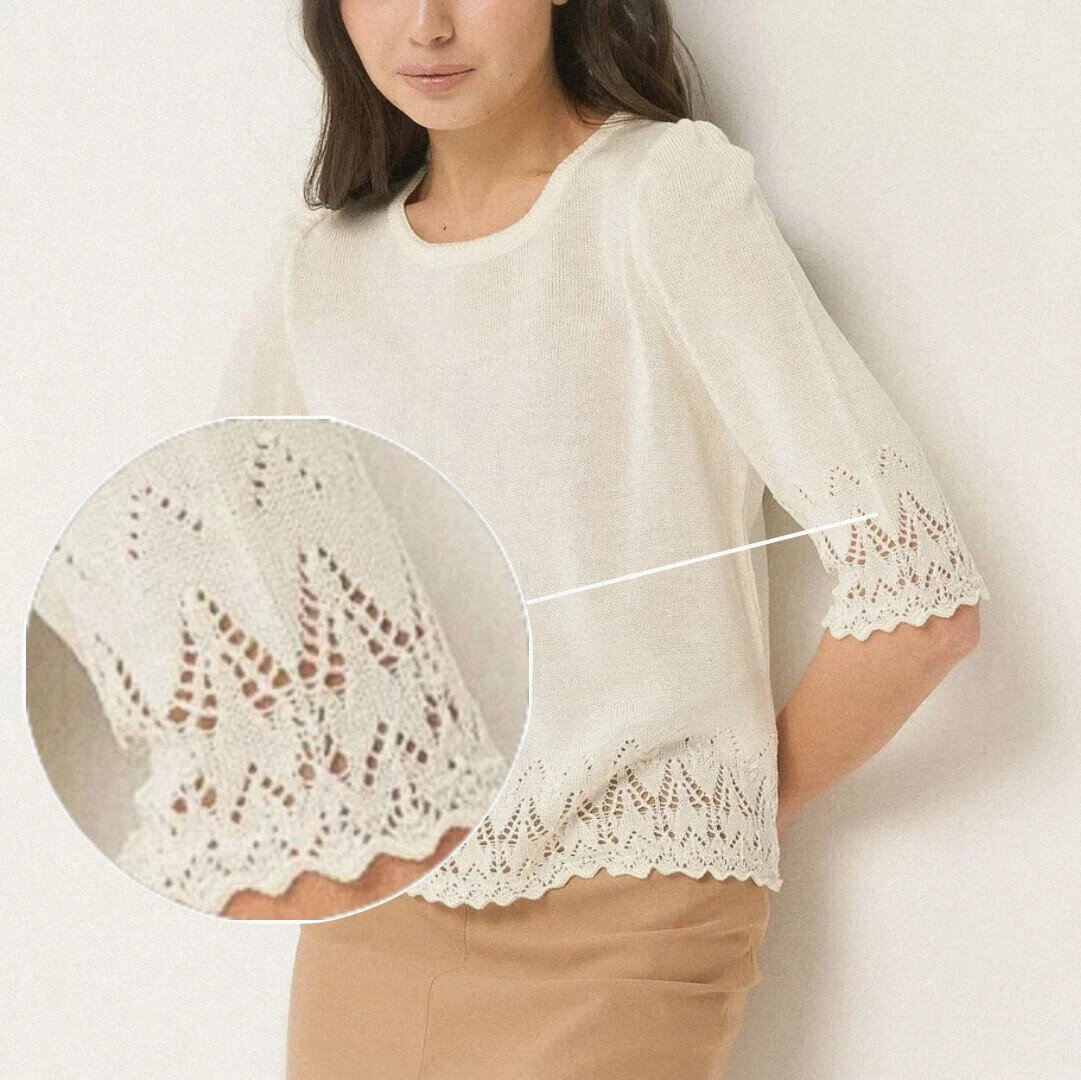 На изображении женщина в светлом топе с кружевными рукавами. Вставка увеличения показывает детали кружевного узора на рукаве.