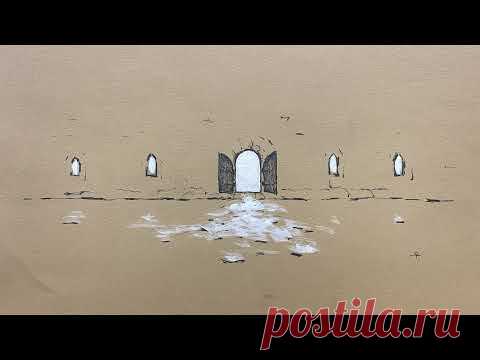 На картинке изображено искусственное отверстие, создающее иллюзию двери в стене с четырьмя окнами по бокам и лужей воды перед ней, напоминающей отражение. Это может быть художественный мурал или рисунок, имитирующий архитектурный фасад.