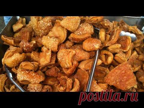 На изображении присутствует металлический поднос, наполненный хрустящими жареными частями, похожими на свиные шкурки или чичарроны — популярный закусочный продукт.