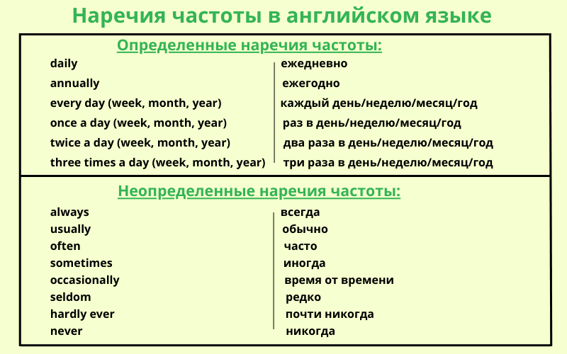 Таблица с переводом наречий частоты с русского на английский язык, включающая определенные и неопределенные выражения частотности.