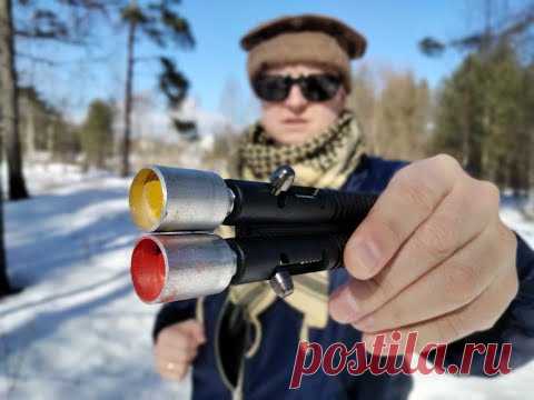 Человек в зимней одежде держит в руках охотничье ружье с двумя стволами, которые выходят на первый план. На заднем фоне видна заснеженная местность и деревья.