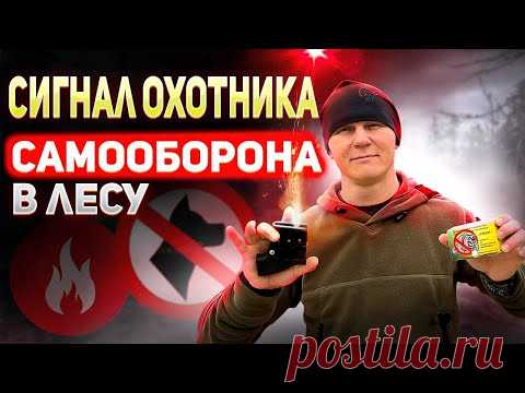 На изображении представлен мужчина в шапке и спортивной кофте, который держит в руках какой-то предмет, возможно фонарик, и банку с напитком. В фоне изображены огонь и символ запрета использования огня. Текст на изображении на русском языке, который гласит "СИГНАЛ ОХОТНИКА САМООБОРОНА В ЛЕСУ", и логотип "postila.ru".
