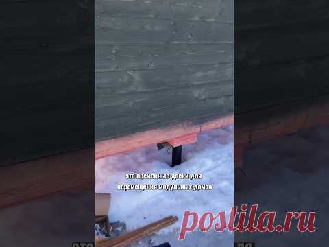 На изображении виден угол строения, сделанного из темных деревянных брусьев, установленного на фундаменте над неровной поверхностью снега. На фундаменте виден металлический кронштейн для крепления. Внизу фотографии присутствует текст: "Это временная домкрат для перемещения маленьких домов". Сайт "postila.ru" указан в правом верхнем углу.