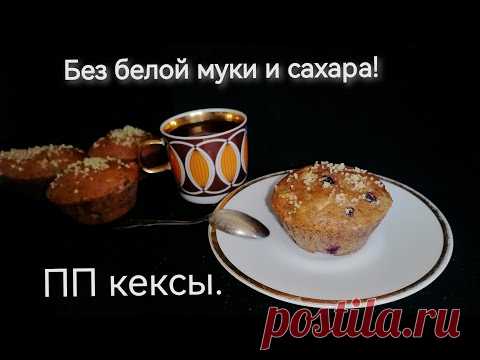 На изображении представлены маффины или кексы на тарелке, рядом с которыми находится чашка, возможно, с чаем или кофе. Текст на изображении гласит: "Без белой муки и сахара! ПП кексы." Это может указывать на то, что кексы приготовлены с учетом принципов правильного питания, без использования рафинированных ингредиентов.