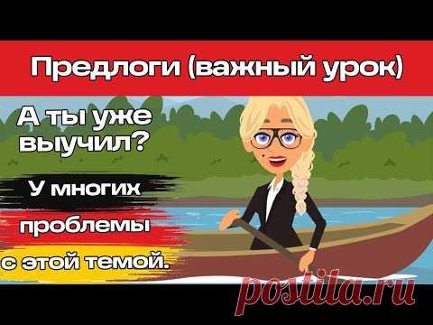 На изображении представлен анимированный персонаж женщины, гребущей в лодке на фоне реки и леса. Текст на русском языке говорит о предлогах как важном уроке, спрашивает, выучил ли кто-то и отмечает, что у многих проблемы с этой темой.