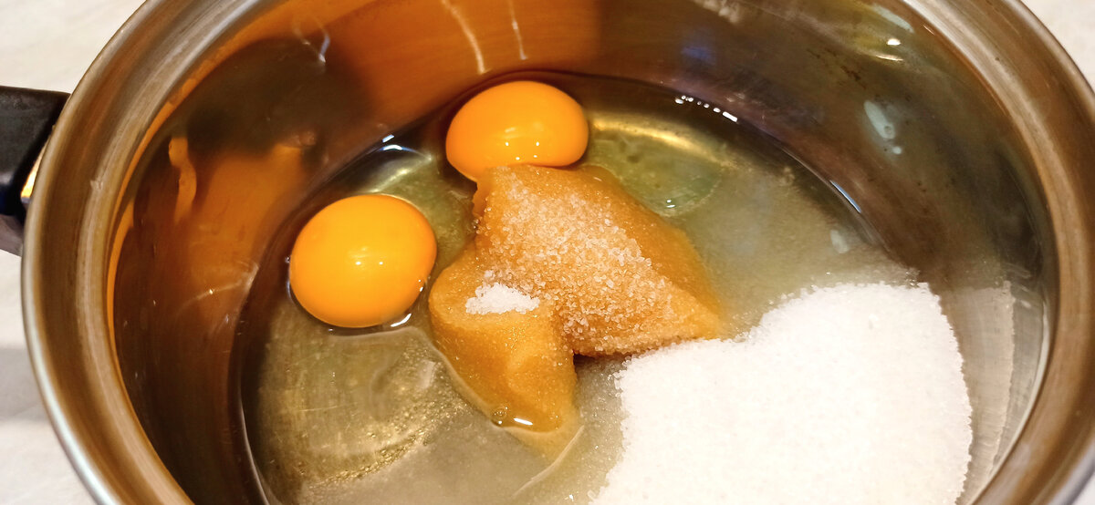 На изображении стальная миска, в которой находятся ингредиенты для приготовления блюда: два яичных желтка, кусок сливочного масла и горсть сахара.