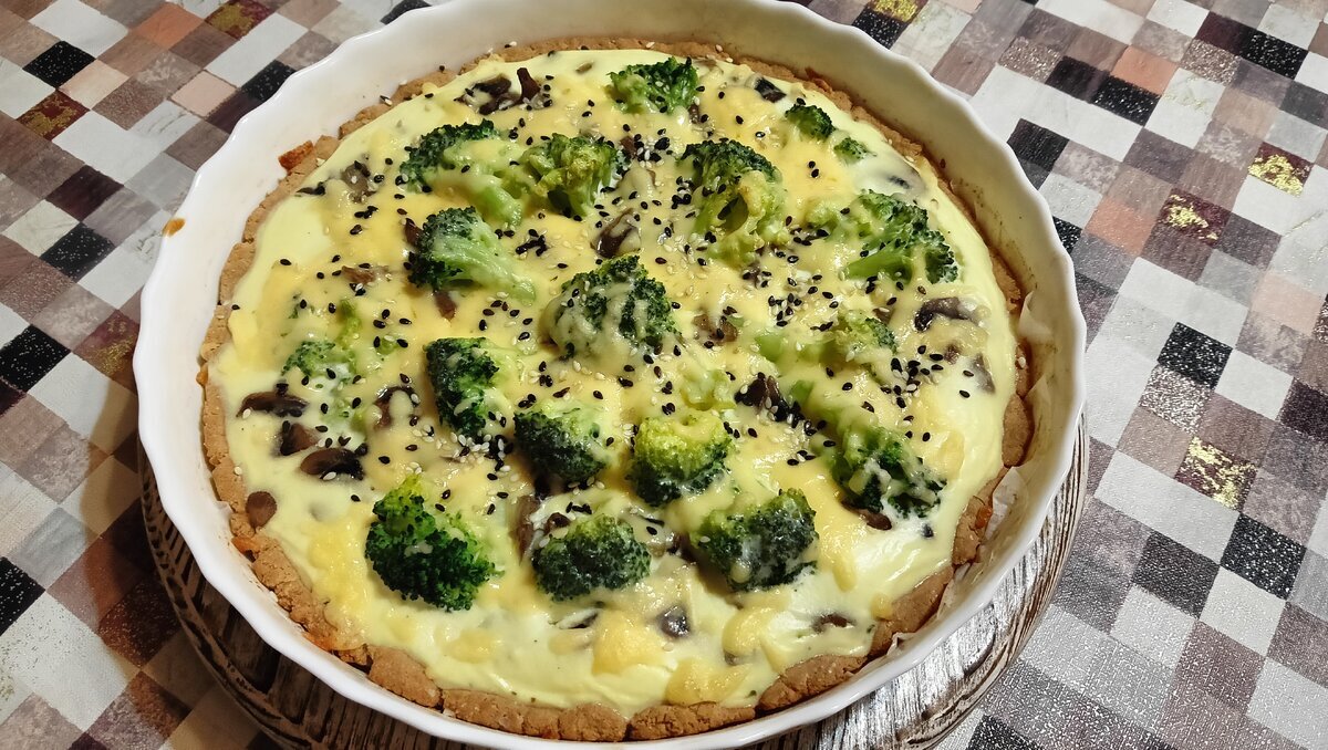 На изображении запеченный киш с брокколи и видимым залитым яично-сливочным соусом. Киш помещен в белую форму для запекания, которая стоит на скатерти в клетку. Брокколи равномерно распределены по поверхности пирога, что придает аппетитный и яркий вид.