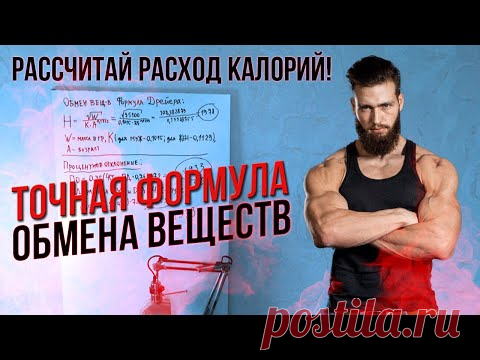 На изображении мускулистый мужчина в фитнес-одежде стоит сложа руки на фоне стенда с текстом на русском языке, предлагающим формулу для расчета калорий. Текст содержит фразы "рассчитай расход калорий" и "точная формула обмена веществ". Фон изображения синего цвета, а также присутствует ссылка на веб-сайт "postila.ru".