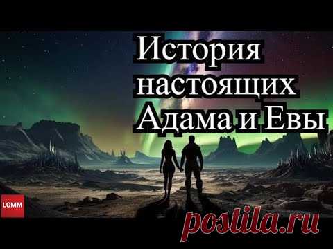 На изображении представлена обложка книги или плакат с заголовком "История настоящих Адама и Евы". Внизу изображения видна пара, стоящая перед фантастическим ландшафтом с горами и северным сиянием на ночном небе. В нижнем правом углу находится водяной знак "postila.ru".