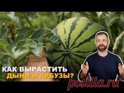 На изображении мужчина жестикулирует руками, фон украшен изображением крупного арбуза и зеленых листьев. Надпись на русском языке гласит: "Как вырастить дыни и арбузы?" Это похоже на обложку образовательного контента или статьи по садоводству.