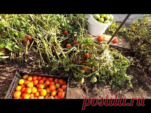 На изображении показан урожай помидоров в домашнем огороде. Видно несколько кустов помидоров, некоторые из которых еще не созрели. В левом нижнем углу - коробка, наполненная красными спелыми помидорами. В центре есть ведро, в котором лежат зеленые помидоры.