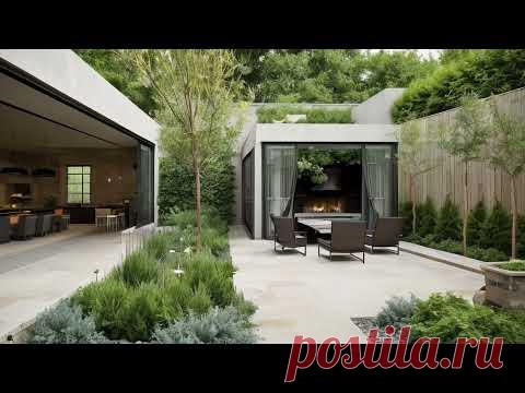 На картинке изображен современный сад с лаунж-зоной. В центре расположен камин, вокруг которого установлена мебель для отдыха. Сад оформлен декоративными растениями и окружен зелеными насаждениями.