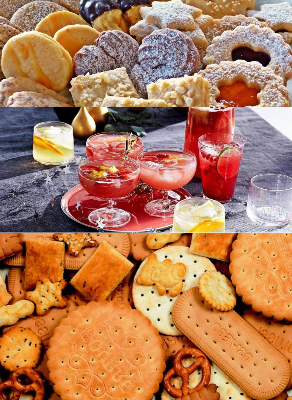 Коллаж из трех различных изображений с едой и напитками. Верхний снимок показывает разнообразные печенья, покрытые сахарной пудрой и шоколадом. Средний снимок демонстрирует напитки в стеклянных бокалах, в том числе коктейли и лимонад. Нижнее изображение содержит различные печенья с рельефным узором.