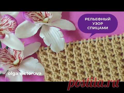 Картинка демонстрирует образец вязания рельефного узора спицами. На фоне расположены цветы орхидей, а внизу виден название и автор: olga viktorova. Изображение включает текст с сайта positiia.ru.