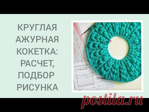 На изображении представлена круглая вязаная кокетка темно-зеленого цвета, наложенная на лист с рукописными записями и схемами вязания. Текст на картинке гласит: КРУГЛАЯ АЖУРНАЯ КОКЕТКА: РАСЧЕТ, ПОДБОР РИСУНКА.