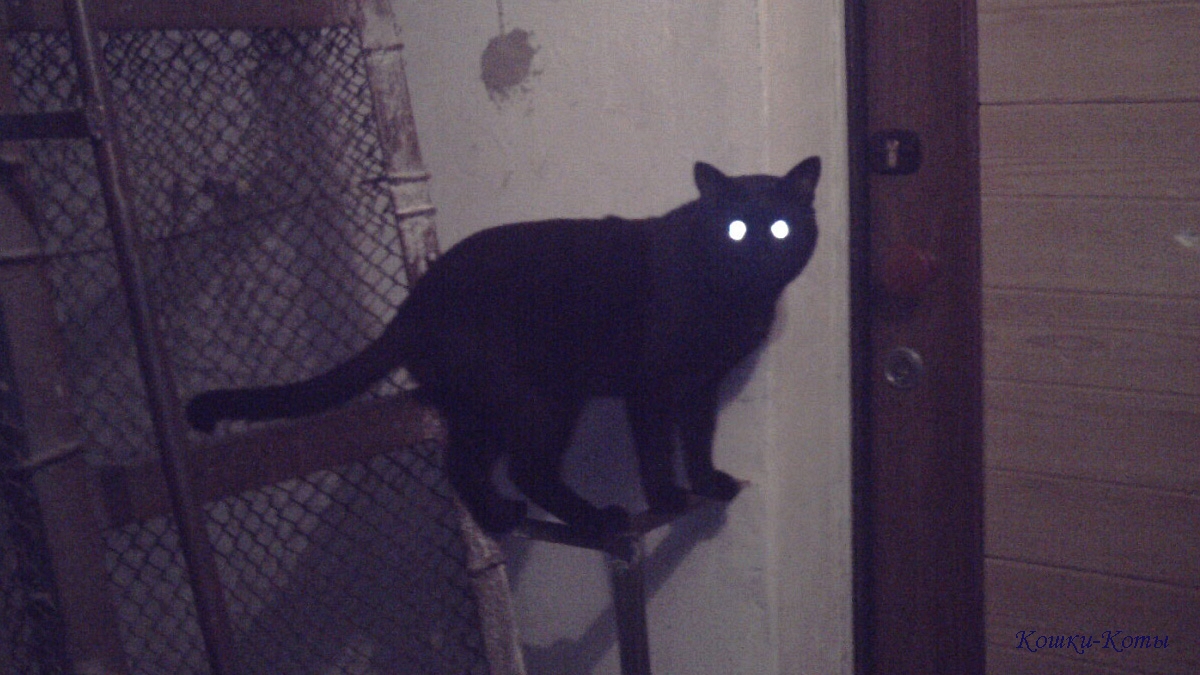 Черный кот сидит на периле у ступенек возле входной двери. Глаза кота светятся из-за отражения света, создавая эффект свечения глаз. Освещение тусклое.