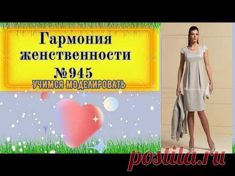 Изображение с рекламой женской одежды. На нем женщина в элегантном белом платье с сумкой. Слева текст "Гармония женственности № 945", а также фраза "Учимся моделировать". Внизу сайт "poshiv.ru". Фон украшают цветы и сияющее сердце.