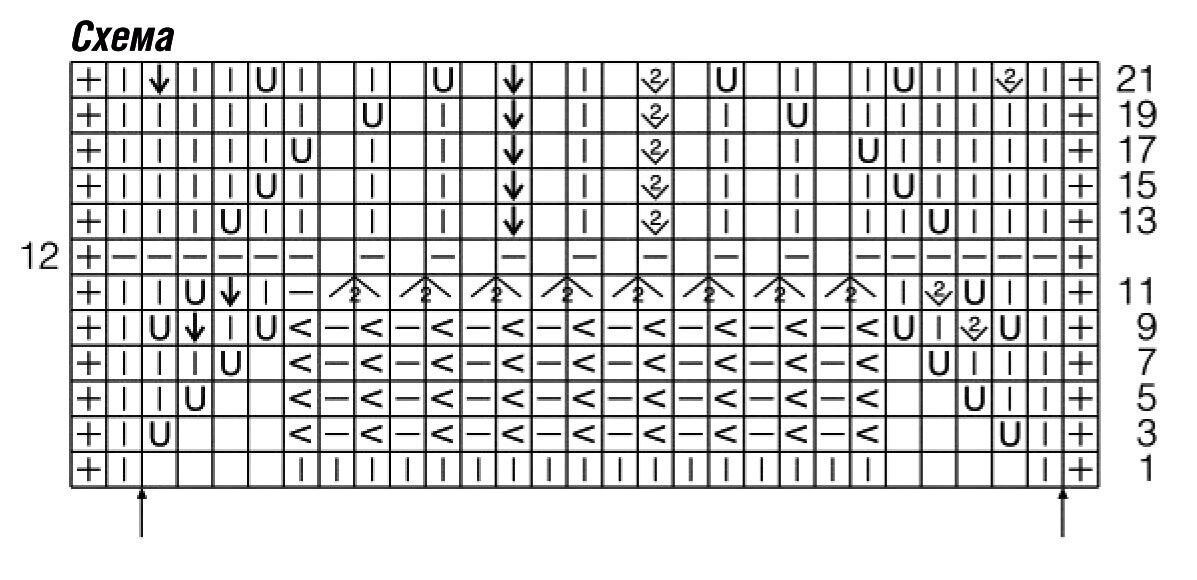 На изображении представлена схема для вязания, скорее всего для вязания крючком или спицами. Схема состоит из различных символов, представляющих разные петли и узоры. В верхней части указаны номера рядов, а с левой стороны — количество петель.