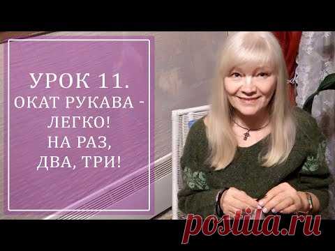 На изображении женщина сидит за столом. Она улыбается и кажется, готовится делать рукоделие или шитьё. На переднем плане находится фиолетовое изображение с текстом на русском языке, который гласит: "урок 11. окат рукава - легко! на раз, два, три!". Фон кажется домашним и уютным.