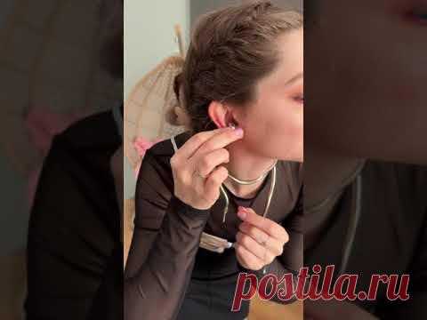 Женщина примеряет серьгу. Она находится в помещении и касается своего уха, возможно, надевая или регулируя украшение.