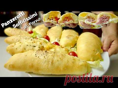 На изображении показаны панцеротти - традиционные итальянские закрытые пирожки с начинкой, которые в руках у человека. Они выглядят аппетитно и золотисто-коричневые, возможно, только что извлеченные из печи. Пирожки расположены на белой тарелке, некоторые из них разрезаны и показывают начинку, состоящую из сыра и ветчины. Вокруг пирожков украшение в виде свежих зеленых листьев и красных помидоров.