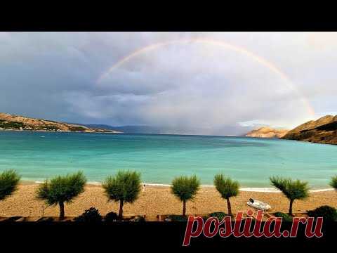 Изображение показывает береговую линию с ярко-голубой водой и песчаным пляжем. На переднем плане ряд небольших деревьев, по-видимому, это молодые оливковые деревья. На пляже виден одинокий лежак. В центре кадра над водной гладью простирается радуга, создавая живописный контраст с темными тучами в небе. Пейзаж выглядит спокойным, но в то же время динамичным из-за сочетания солнечного света и грозовых облаков.