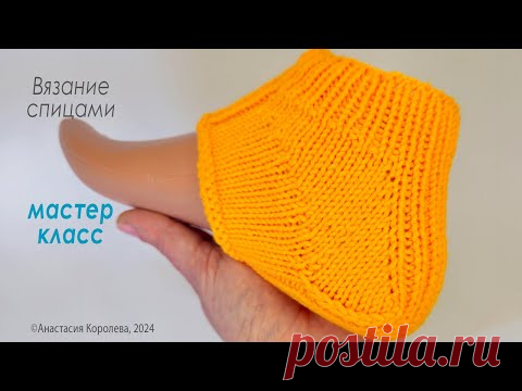На изображении представлены ручные вязаные носки. Кажется, что это часть обучающего материала или мастер-класса по вязанию, так как в описании упоминается "мастер класс". Видно, что носок имеет яркий оранжевый цвет и выглядит новым и аккуратно связанным.