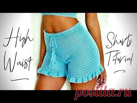 Изображение синих вязаных шортов с высокой талией, одетых на человека. Текст на изображении говорит о том, что это учебное пособие по шортам с высокой талией.