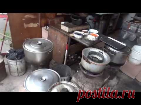 На картинке изображена кухня, похожая на профессиональную или напоминающую уличную пищевую точку. Видны различные утвари и посуда, такие как кастрюли, чашки и сковородки, расставленные на грубой рабочей поверхности.
