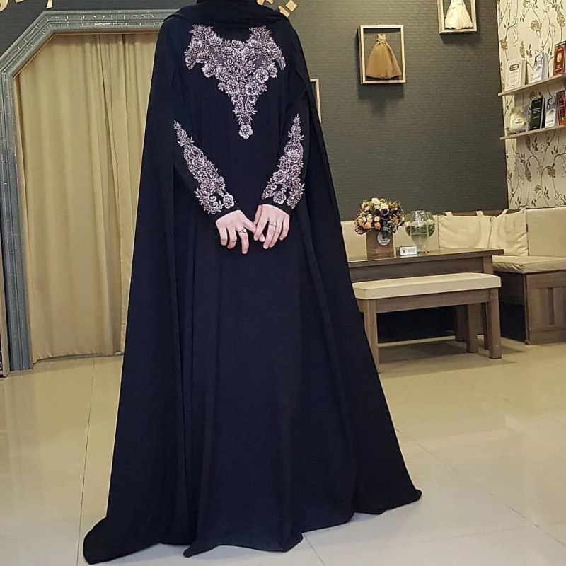 На изображении представлено длинное черное платье или абайя с украшениями из вышивки на груди и на рукавах. Фон состоит из интерьера комнаты с диваном и столиком.