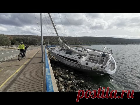 На фотографии изображен опрокинутый парусник у берега в воде. Рядом с ним на набережной виден велосипедист. Погода облачная.