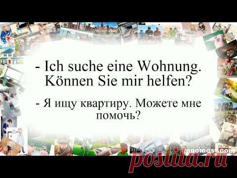 На изображении представлен скриншот с текстом на немецком и русском языках, который является примером перевода. Немецкая фраза гласит: "Ich suche eine Wohnung. Können Sie mir helfen?", что переводится на русский как: "Я ищу квартиру. Можете мне помочь?". Фоном для текста служат размытые изображения различных сцен, предположительно связанных с языковым обменом или обучением языкам.