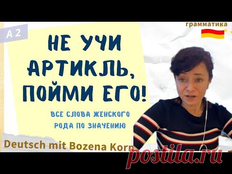 На изображении видна женщина, которая, возможно, проводит учебный урок или вебинар по немецкому языку. На переднем плане расположен слайд с текстом на русском языке: "Не учи артикль, пойми его! Все слова женского рода по значению". Также виден подзаголовок "Deutsch mit Bozena Korn", что предполагает имя преподавателя или ведущего. Фон изображения оформлен в ярких тонах.