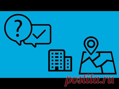 На изображении представлены три пиктограммы на синем фоне. Слева пиктограмма обсуждения с вопросительным и галочкой, по центру изображение здания, справа пиктограмма карты с местоположением.