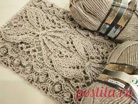 На изображении представлены вязаные изделия и клубки пряжи. Видны узоры вязки и текстура материала. Пряжа имеет бежевый оттенок.