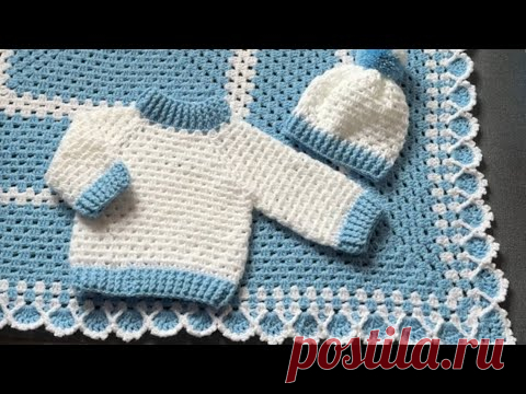 На изображении представлены вязаные детские вещи - свитер и шапочка светло-голубого и белого цвета, расположенные на вязаном полотне с кружевными краями того же цвета.