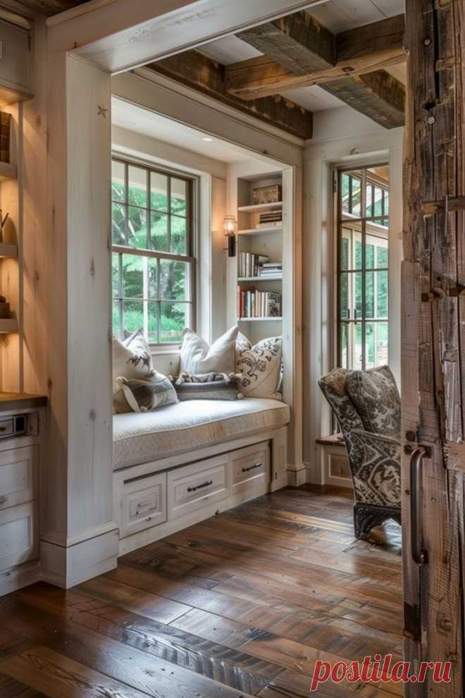 Уютный уголок с мягкой скамейкой у окна в помещении с деревянными элементами и теплым освещением. Интерьер дополнен подушками и встроенными полками с книгами.