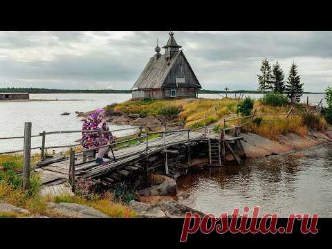 На изображении деревянная церковь на берегу реки с деревянным мостом, по которому идет женщина в традиционной одежде. Небо облачное, природа показывает начало осени.