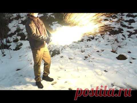 Человек в куртке и штанах стоит на снегу и держит в руках предмет, из которого вырывается поток ярких искр. Вокруг тихая зимняя природа.