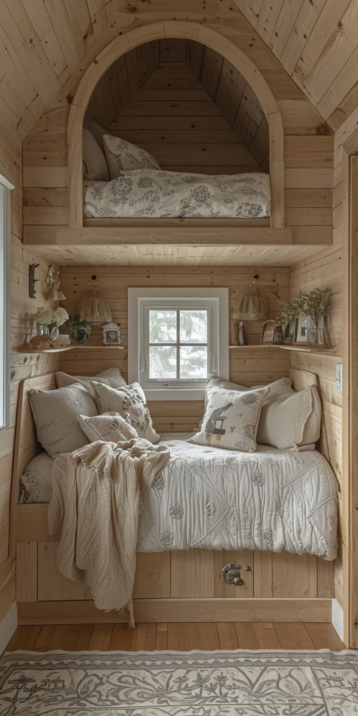 Уютная деревянная спальня с двухъярусной кроватью. На нижнем ярусе расположена кровать с мягким покрывалом и подушками, а сверху - вторая кровать доступная по лестнице. Интерьер выполнен в светлых тонах с элементами деревенского стиля. В комнате присутствуют элементы декора и большое окно, через которое проникает естественный свет.