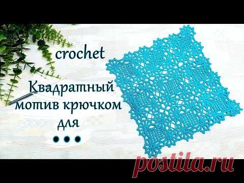 На изображении представлен синий квадратный вязаный крючком мотив на белом фоне с элементами зелени в верхней части и написанными словами на русском языке, указывающими, что это вязаный крючком мотив. Также видны английские слова, обозначающие вязание крючком.