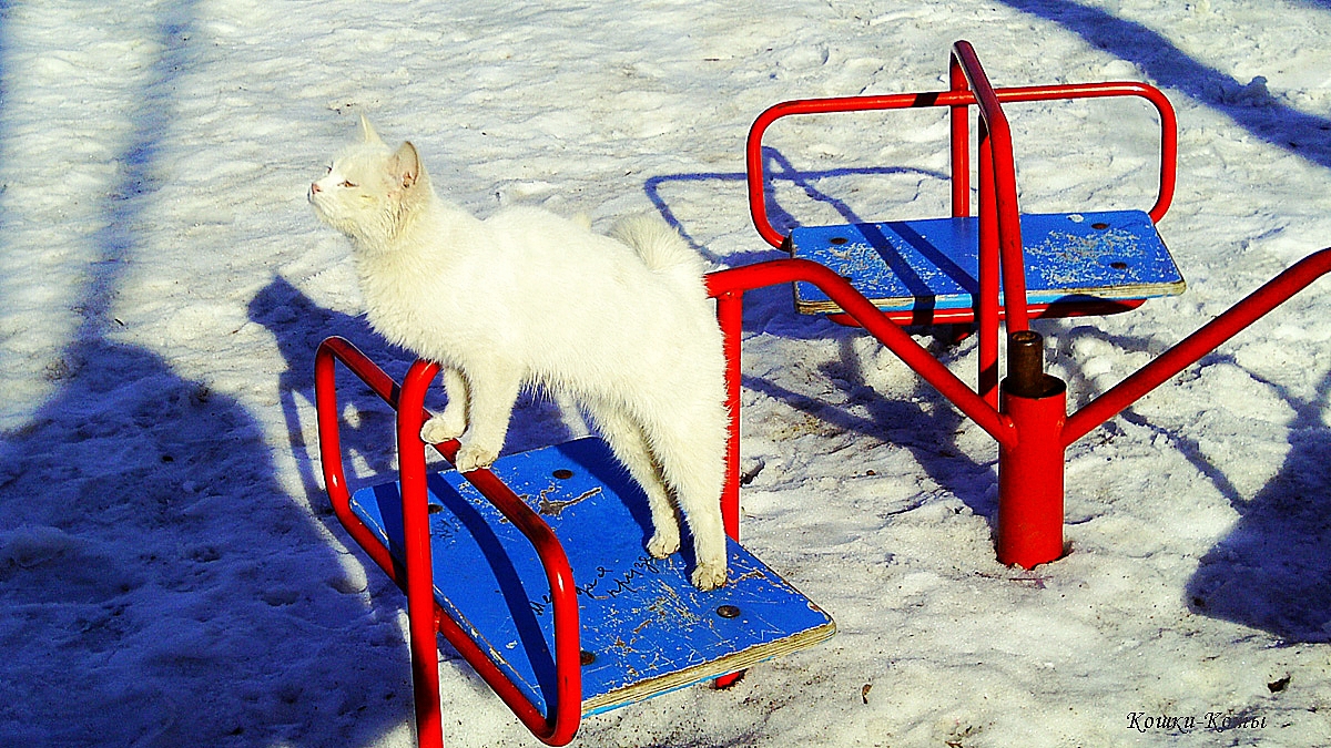 Белый кот на уличном красном синем спортивном тренажере на фоне снега.