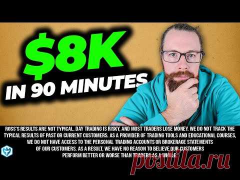 На изображении представлен мужчина с бородой, стоящий перед фоном с текстом. Текст гласит: "$8K IN 90 MINUTES", подчеркивая утверждение о получении прибыли. Сопроводительный текст предупреждает, что результаты Росса не типичны и торговля на дневных рынках сопряжена с риском, а также содержит отказ от ответственности. В правом нижнем углу находится URL "positila.ru".