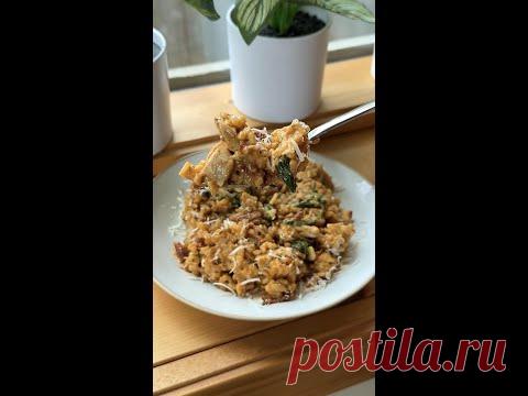 На изображении видно блюдо, похожее на жареный рис, который подается на белой тарелке. Вокруг тарелки нет других предметов, кроме столового прибора, воткнутого в рис, и растения в горшке на фоне.
