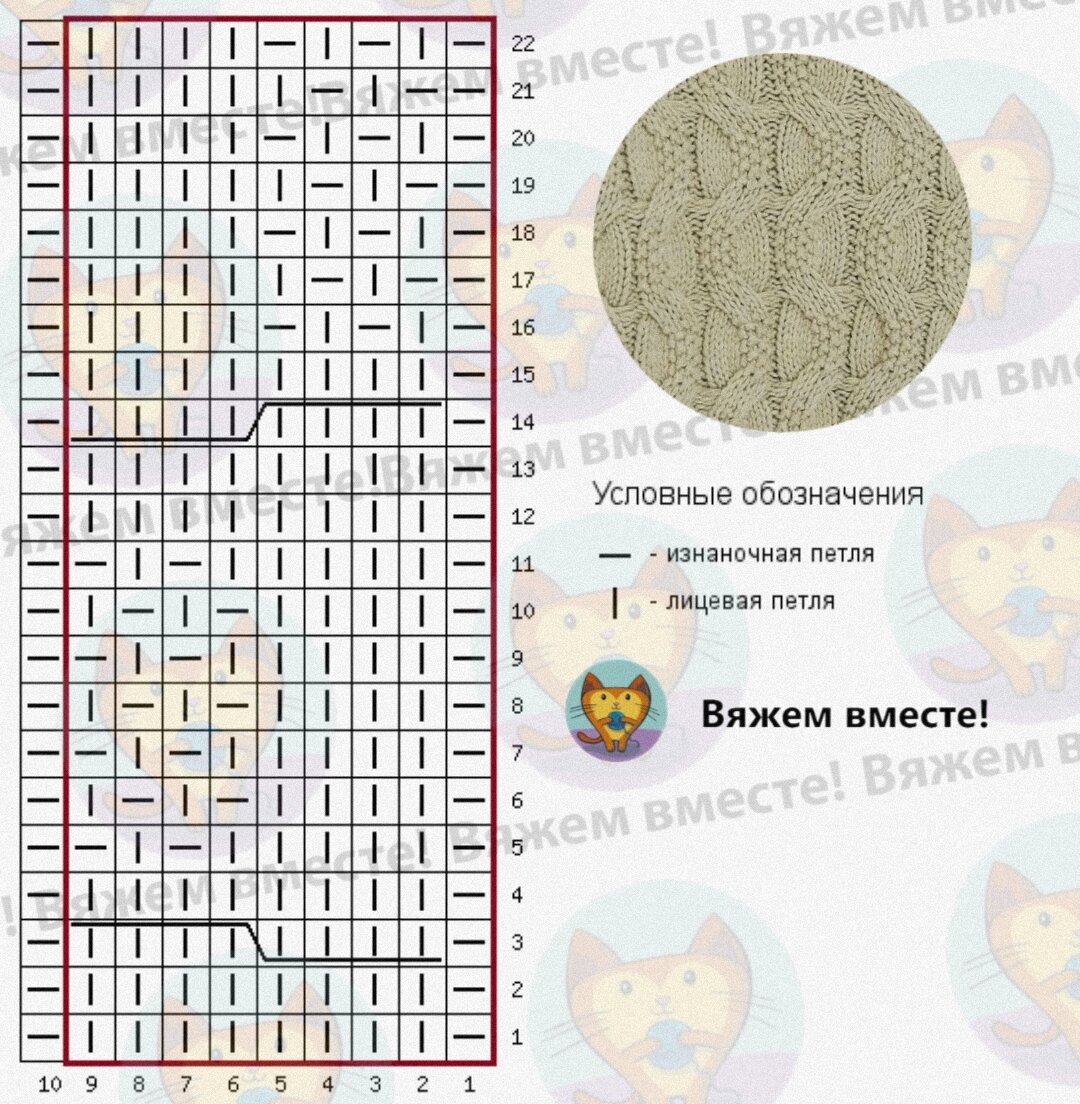Схема вязания с использованием различных типов петель, представленная на левой стороне изображения, и образец вязаного круглого мотива на правой стороне. В нижней части изображения логотип и призыв "Вяжем вместе!" на русском языке.